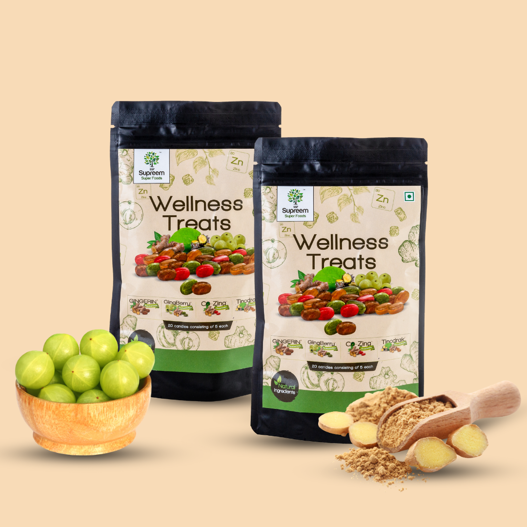 Wellness Treats is a combo pack containing Tinodrak™, Gingerin®, GingBerry™, and Co-Zing™ candies, each one of them in its individual pack. Tinodrak™ is an immunity booster candy consisting of Ginger and Tinospora. Gingerol in Ginger is an active component that makes Ginger a perfect immunity booster. Additionally, Ginger has anti-bacterial and anti-inflammatory properties, which helps in fighting infections. Its other ingredient, Tinospora is well known for its immune-modulatory properties. It's a powerhouse of antioxidants which fights free radicals, keeps body cells healthy & helps rid the body of diseases. It removes toxins, purifies blood and fights bacteria.
